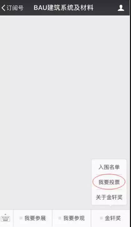 進(jìn)入微信,找到“BAU建筑系統(tǒng)及材料”點(diǎn)擊右下方“金軒獎-我要投票”欄目進(jìn)入投票頁面進(jìn)行投票。