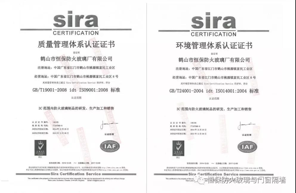 鶴山市恒保防火玻璃廠有限公司,自2014年第一次獲得ISO9001-2008質(zhì)量管理體系、ISO14001-2008環(huán)境管理體系認(rèn)證。并與原企業(yè)管理體系相結(jié)合,與CCC強(qiáng)制性認(rèn)證產(chǎn)品企業(yè)管理體系相融合,建立了更完善的科研、開發(fā)、生產(chǎn)、銷售和售后服務(wù)體系,使恒保公司穩(wěn)健快速增長(zhǎng)。